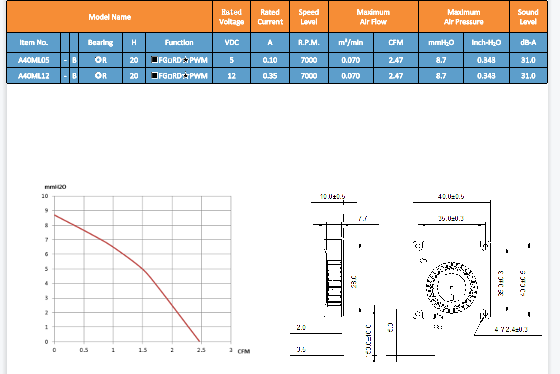 叶轮:塑料(UL94V-0) 框架:塑料(UL94V-0) 引线:定制 重量:9.5克