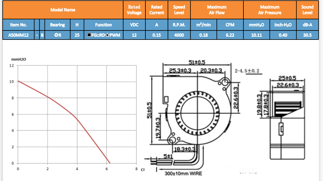 叶轮:塑料(UL94V-0) 框架:塑料(UL94V-0) 引线:定制 重量:33克