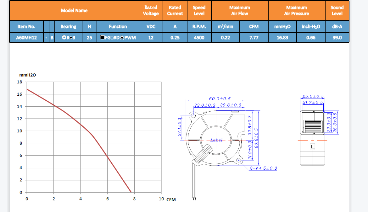 叶轮:塑料(UL94V-0) 框架:塑料(UL94V-0) 引线:定制 重量:22克 框架类型:封闭法兰