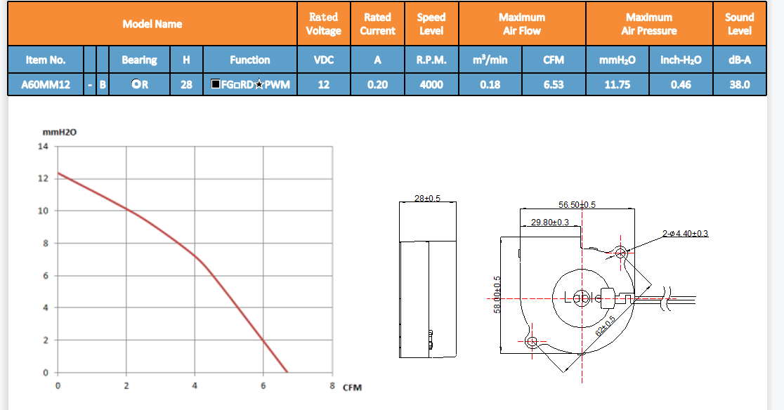 叶轮:塑料(UL94V-0) 框架:塑料(UL94V-0) 引线:定制 重量:6g 框架类型:封闭法兰