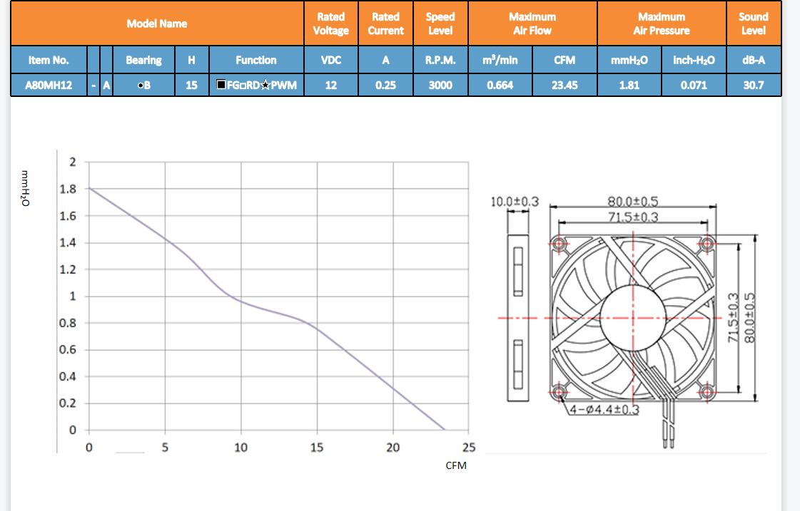 叶轮:塑料(UL94V-0) 框架:塑料(UL94V-0) 引线:定制 重量:8克 框架类型:封闭法兰